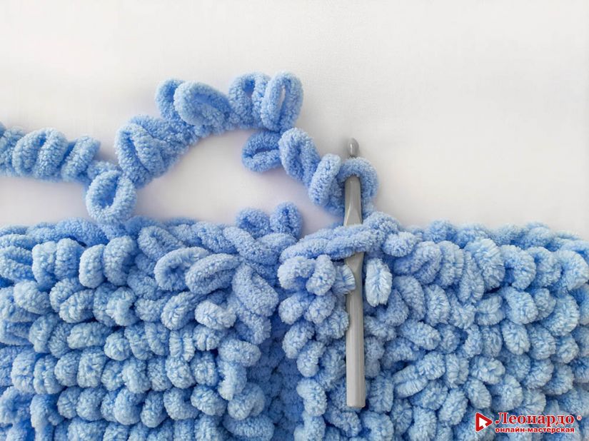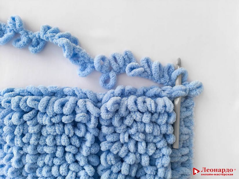 Заводим крючок за кромочные петли, как показано на фото. И протягиваем петлю из нити.