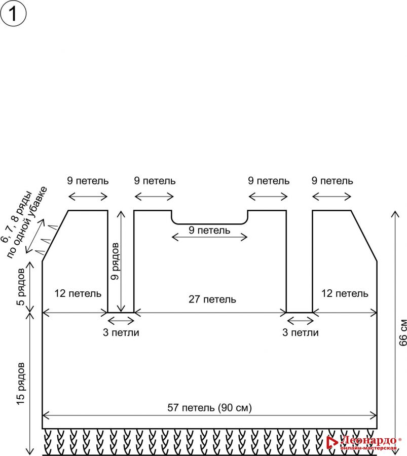 2. Далее при помощи маркеров для вязания делим полотно на 5 частей, как показано на схеме. По 12 петель на полочки, 27 петель на спинку и по 3 петли на пройму.