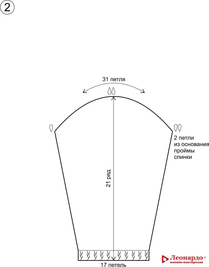 2 подряд: пропускаем первую петлю провязываем 29 петель и вместо прибавки добавляем и провязываем одну петлю из основания проймы. Итого у нас 31 петля.