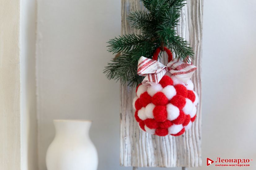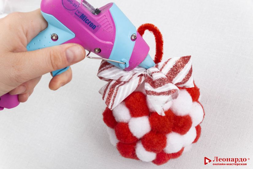 3. Обклеим шарик помпонами Hobbius (арт. SKPF-20), чередуя белые и красные.