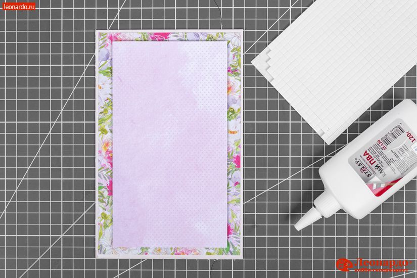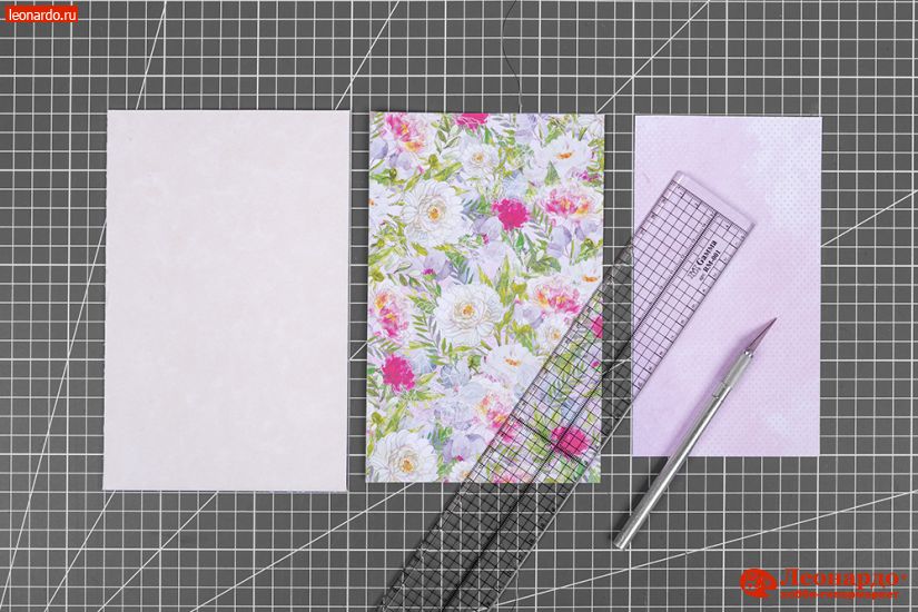1. Из пивного картона Love2art (арт. KLP-03) вырезаем прямоугольник размером 20х13 см. Из бумаги для скрапбукинга Mr.Painter (арт. PSR-Q, 200102 "Пионы") с цветочным активным принтом вырезаем деталь размером 19.5х12.5 см и из листа с фоновым принтом вырезаем деталь 18х10 см.