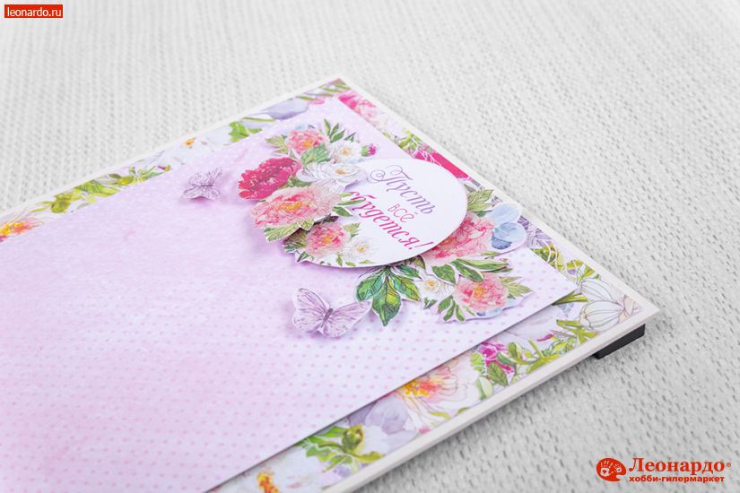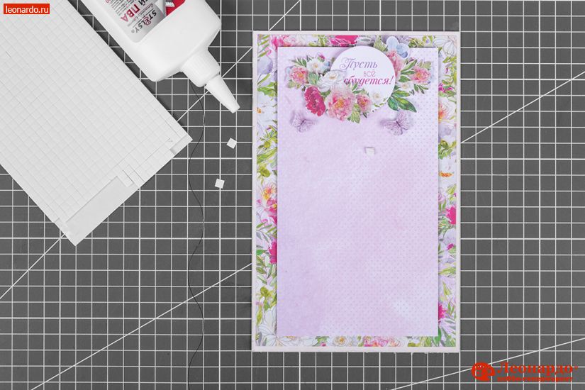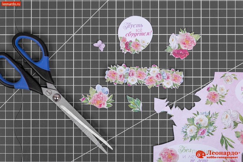 4. Складываем элементы в композицию в верхней части основы и приклеиваем надпись на клеевые подушечки. Цветы под надпись приклеиваем на клей ПВА STILSY(арт. ST-120), а верхние цветы и бабочек – на клеевые подушечки.