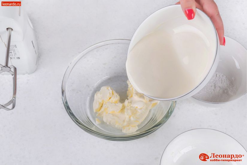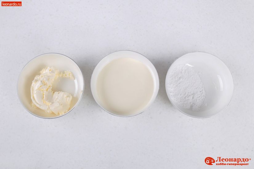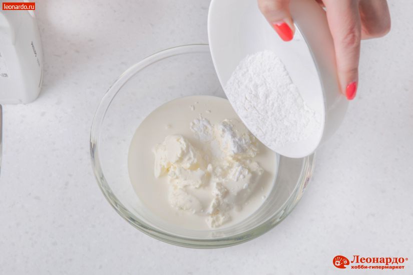 5. Приступаем к готовке крема. Соединяем холодные сливки (150 г), сыр комнатной температуры (150 г) и сахарную пудру (20 г).