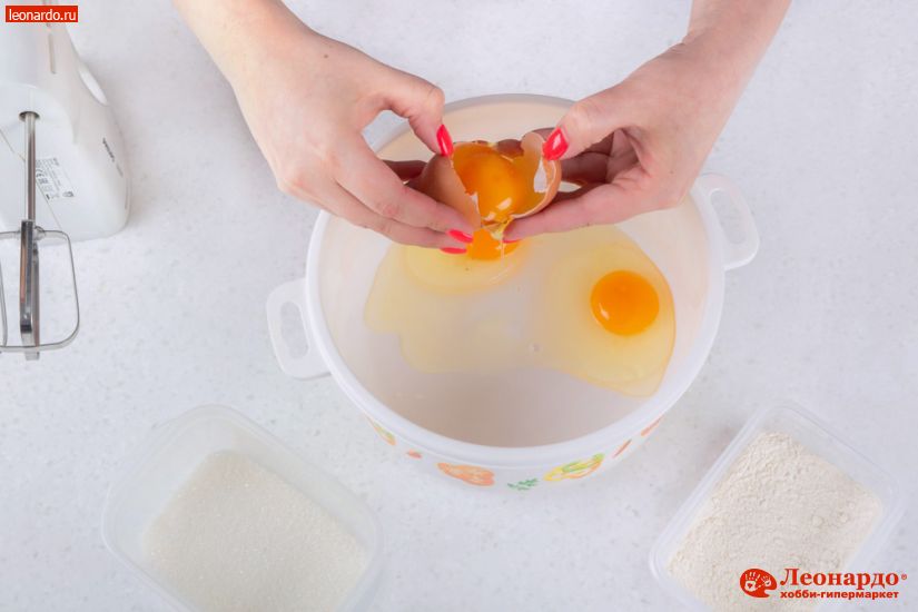 1. Взбиваем яйца (3шт.) с сахаром (90 г) до образования пышной массы.