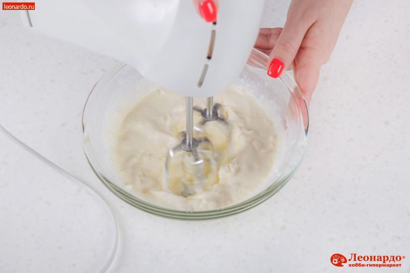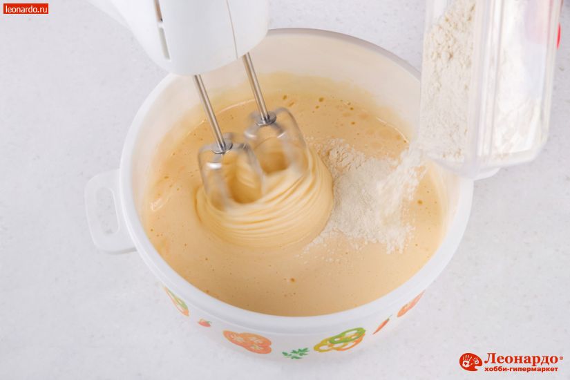 2. Добавляем муку и перемешиваем миксером на медленной скорости.
