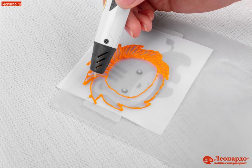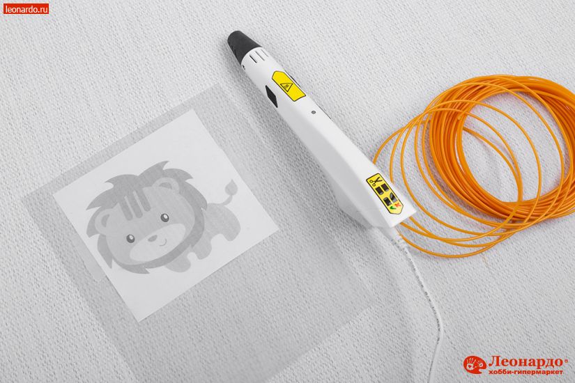 1. Начинаем работу над львенком с подготовки эскиза, вы можете распечатать необходимое изображение или нарисовать его от руки. Располагаем изображение под прозрачной основой Gamma (арт. PSM-01). Включаем ручку"Поделкин" Робокрафтика (арт. RBC-3D-01), ждем, когда она прогреется и загружаем оранжевый филамент (арт. RBC-PLA-02).