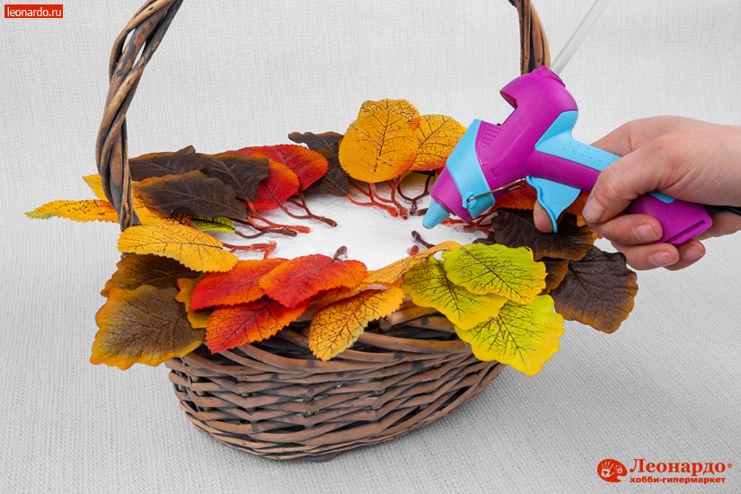 6. После того, как все элементы готовы, приступаем к оформлению корзины. Сначала распределяем листья, маскируя пенопласт.