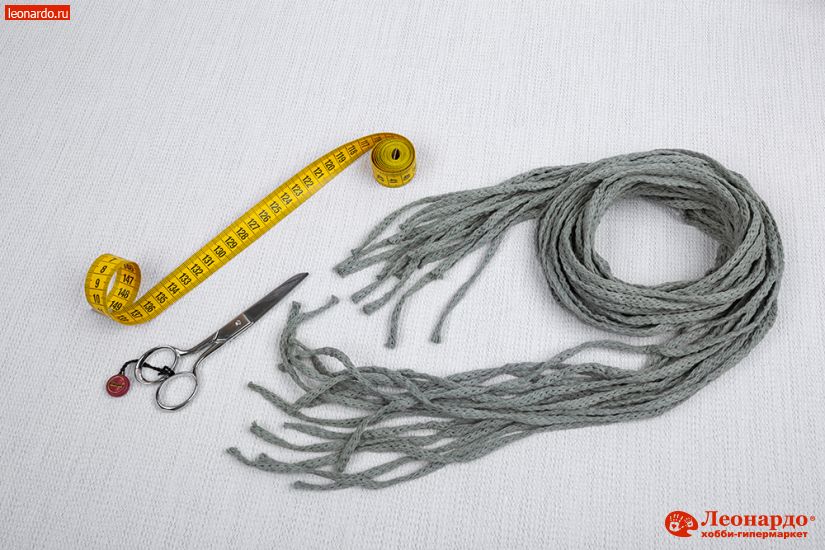 3. Нарезаем нити пряжи ARACHNA Macrame Maxi (№15 хаки). 14 шт. по 250 см на основную часть и 6 шт. по 260 см на боковые части.