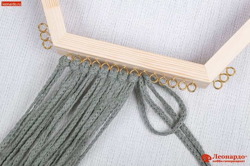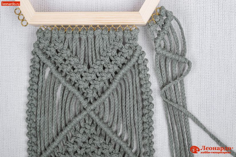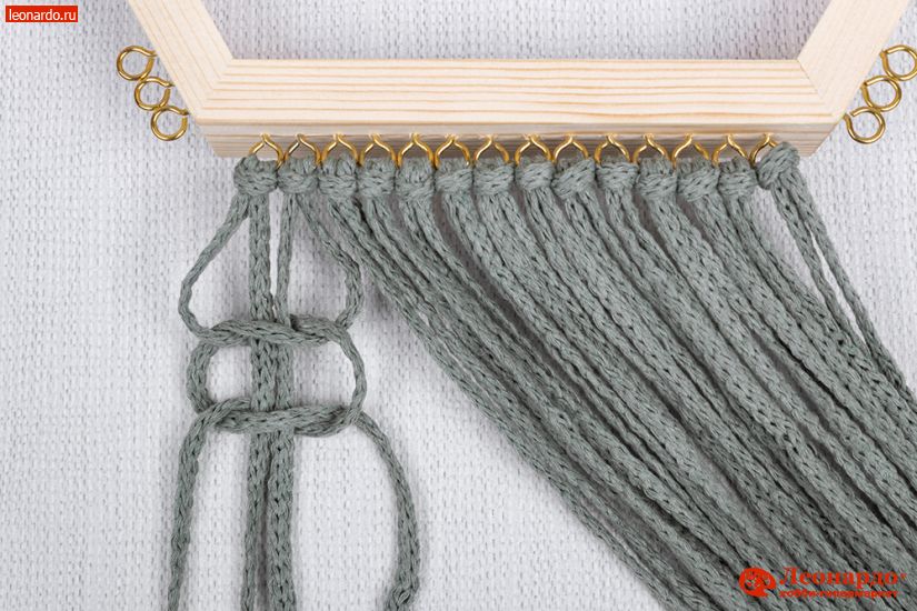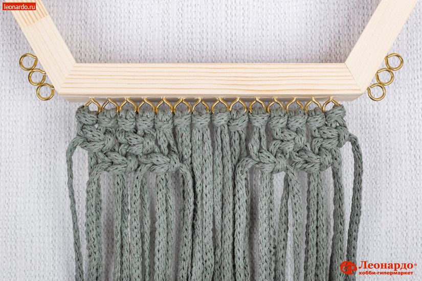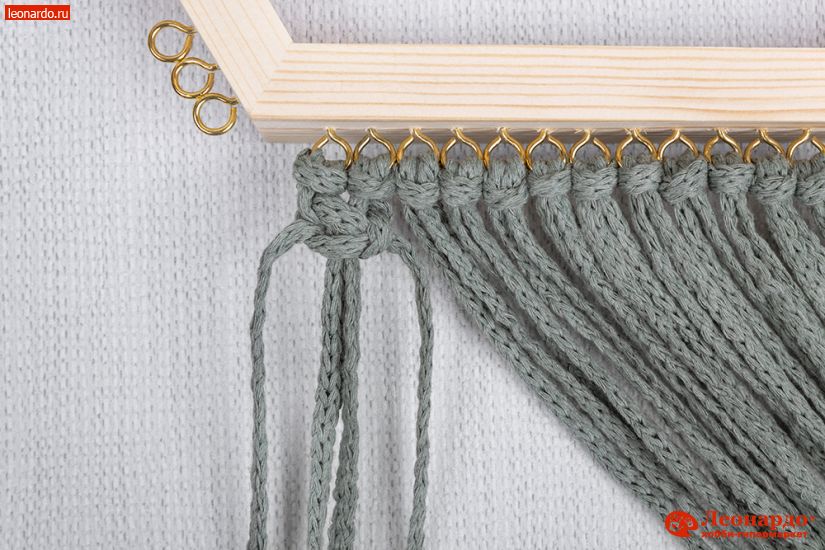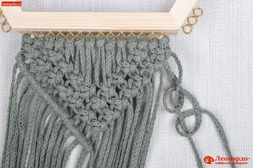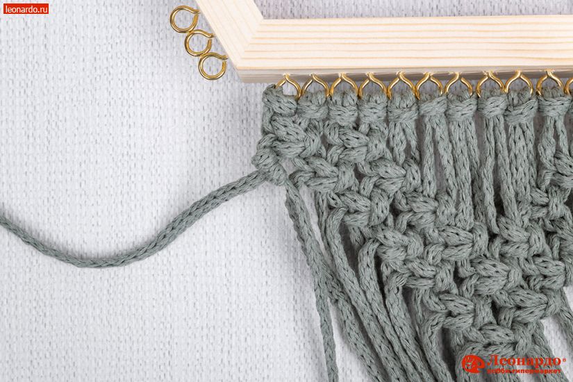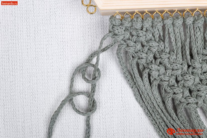 24. Чтобы панно повесить на стену, плетем цепочку из петельных узлов. Для этого перекидываем нить длиной 150 см через «подвес». И начинаем плести узлы. Когда сплели цепочку нужной длины, привязываем концы нитей ко второму «подвесу» на 2 простых узла. Крепко затягиваем. Кончики обрезаем и прячем в плетение. Вкручиваем крючки с цепочкой по краям рамы.