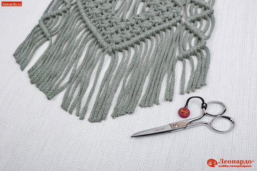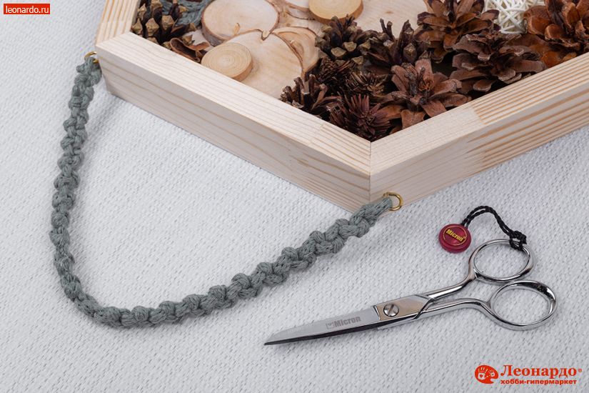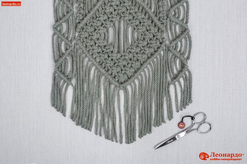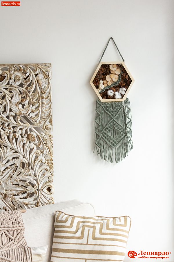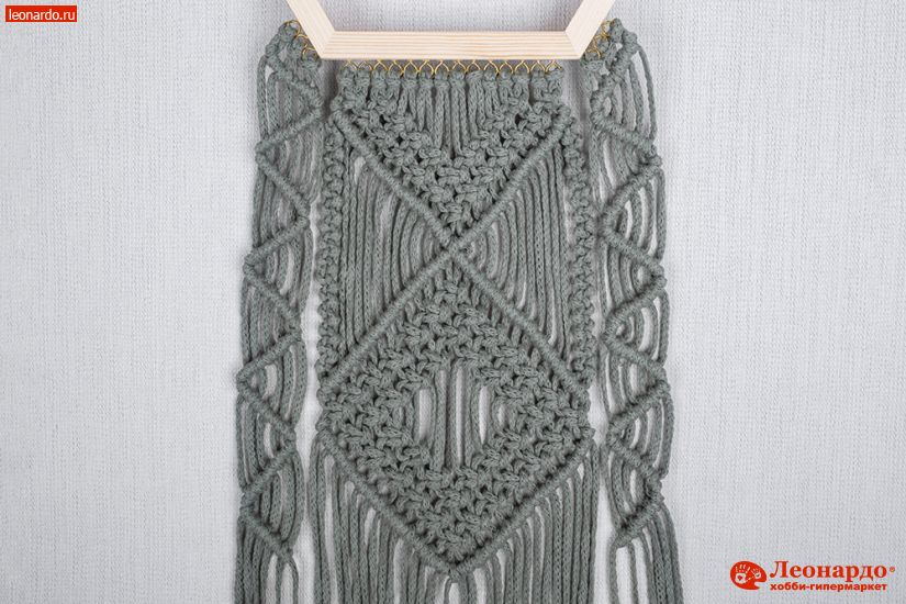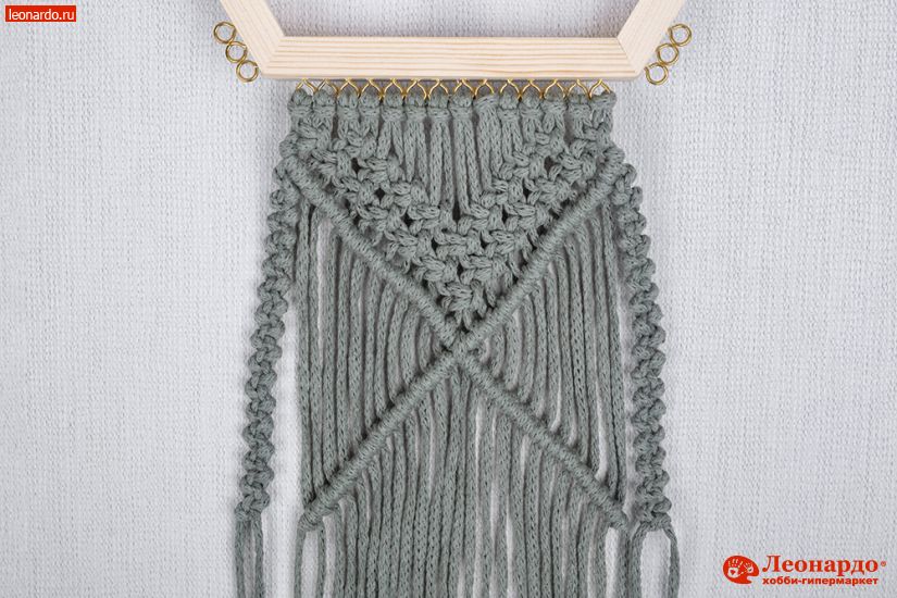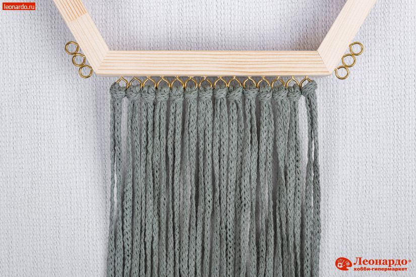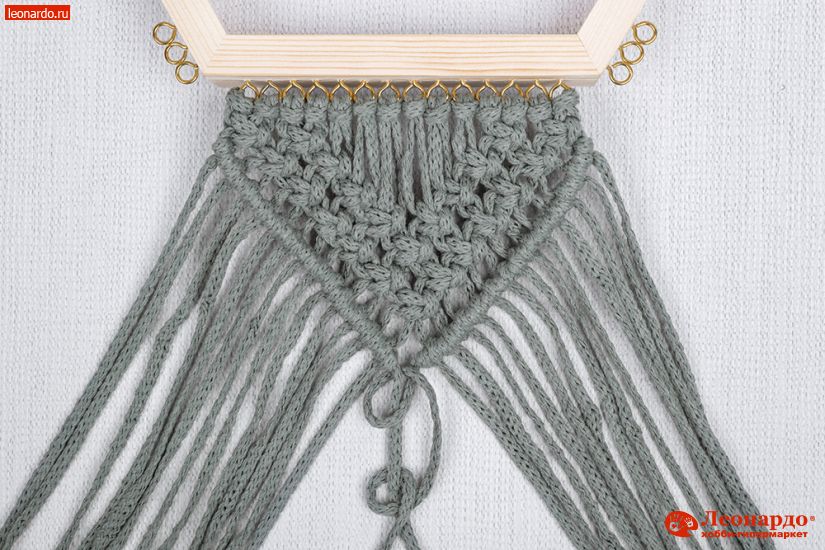 24. Чтобы панно повесить на стену, плетем цепочку из петельных узлов. Для этого перекидываем нить длиной 150 см через «подвес». И начинаем плести узлы. Когда сплели цепочку нужной длины, привязываем концы нитей ко второму «подвесу» на 2 простых узла. Крепко затягиваем. Кончики обрезаем и прячем в плетение. Вкручиваем крючки с цепочкой по краям рамы.
