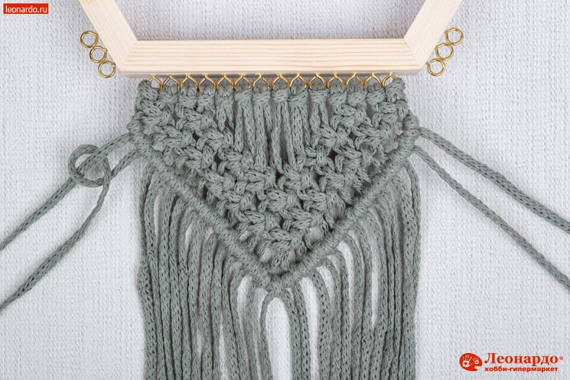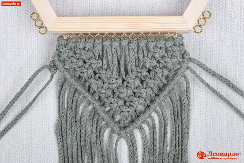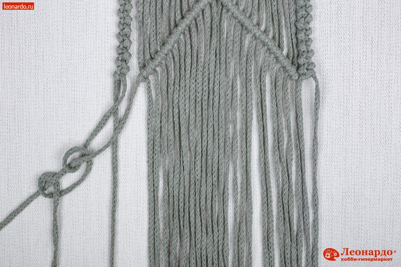 18. Навешиваем 3 нити на крючки справа от основного панно. И начинаем плести бриды из репсовых узлов зигзагом. Нить-основа всегда одна и та же - крайняя правая. Меняя ее направление, меняете направление узлов. Таким образом получается зигзаг.