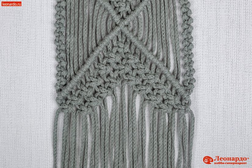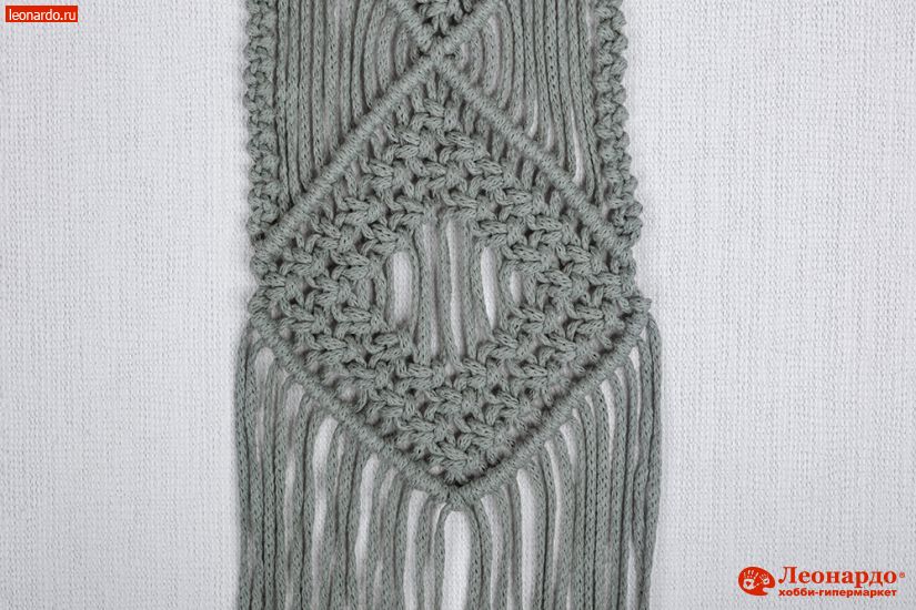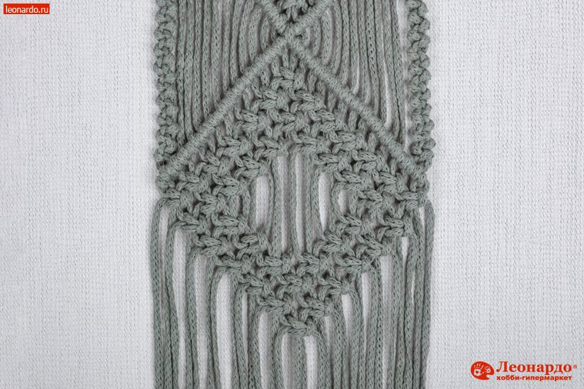 16. Далее плетём ромб из квадратных узлов. Сначала увеличиваем количество узлов, затем уменьшаем (так же как плели первый треугольник).