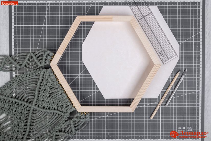 21. Далее на мат GAMMA (арт. DKF-01) кладём лист пивного картона Love2art (арт. KLP-03), а сверху рамку шестигранной формы. И обводим рамку по внешнему краю карандашом "ВКФ" ИНЖЕНЕР (арт. 1237). С помощью ножа Mr.Painter (арт. HKN) и линейки с металлическим краем обрезаем лишнее. Далее приклеиваем картон на суперклей к обратной стороне рамы.