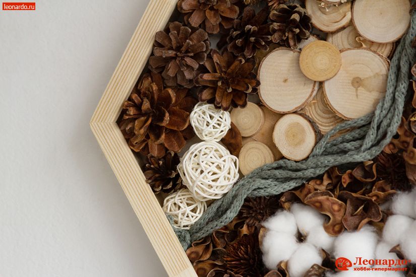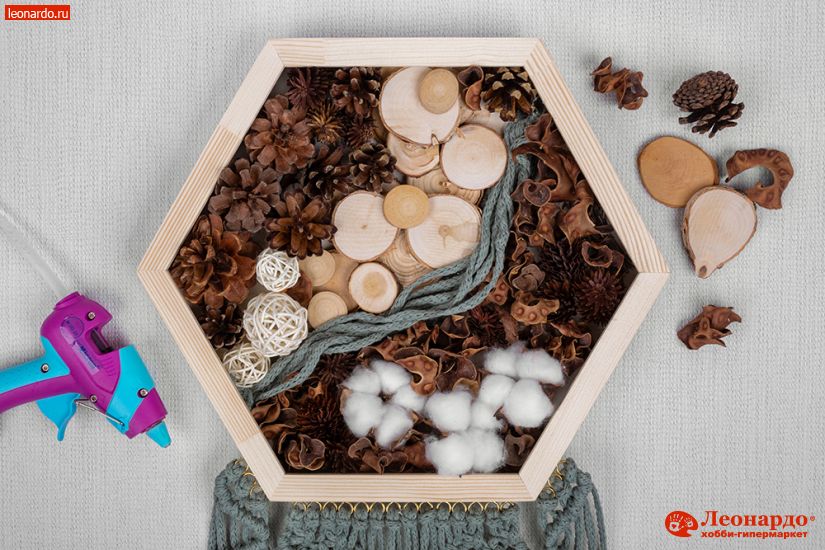 23. Далее собираем панно из сухоцветов Blumentag (арт. SNJ-03, 01). Вы можете проявить фантазию и выложить своим узором или повторить по схеме. Каждый сухоцвет приклеиваем с помощью горячего клея.