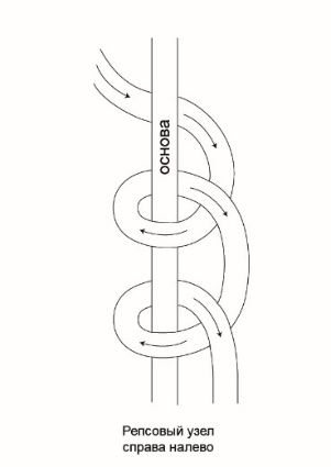 10. С правой стороны также плетём бриду из репсовых узлов. Крайняя правая нить - основа.