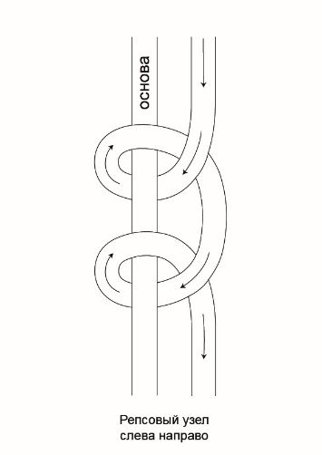 9. Дальше плетём бриду (ряд) из репсовых узлов. Крайняя левая нить - это нить-основа в репсовом узле. Плетем по диагонали вдоль квадратных узлов.