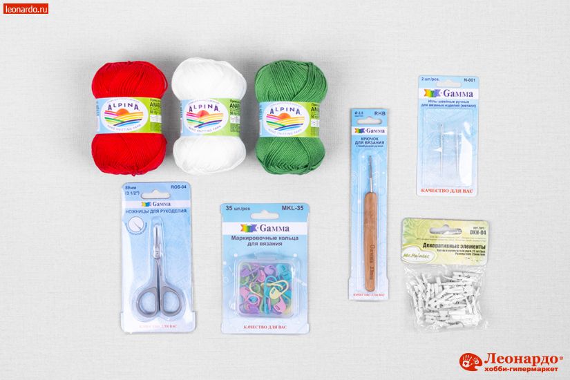 1. Пряжа Alpina "ANABEL" 100% мерсеризованный хлопок 50 г 120 м ± 6 м (№002 БЕЛЫЙ, №007 красный, №162 травяной) – расход по 1 мотку