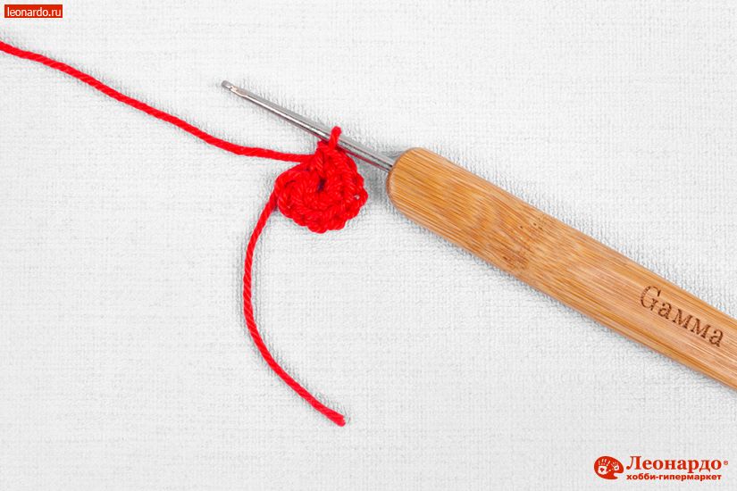 1. Набираем 2 воздушные петли. В первую воздушную петлю провязываем 10 столбиков без накида (далее СБН). Стягиваем отверстие.