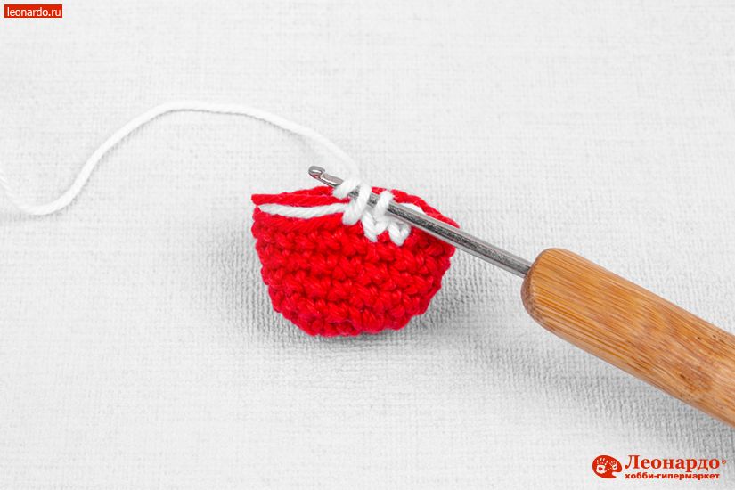 5. Далее вяжем нитью белого цвета 3 ряда по 20 СБН. Красную нить прячем под петлями в новом ряду. На данном этапе маркер можно снять.