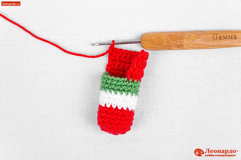 12. Вяжем белым цветом 3 ряда, далее меняем цвет на зелёный и вяжем 3 ряда по 20 СБН.