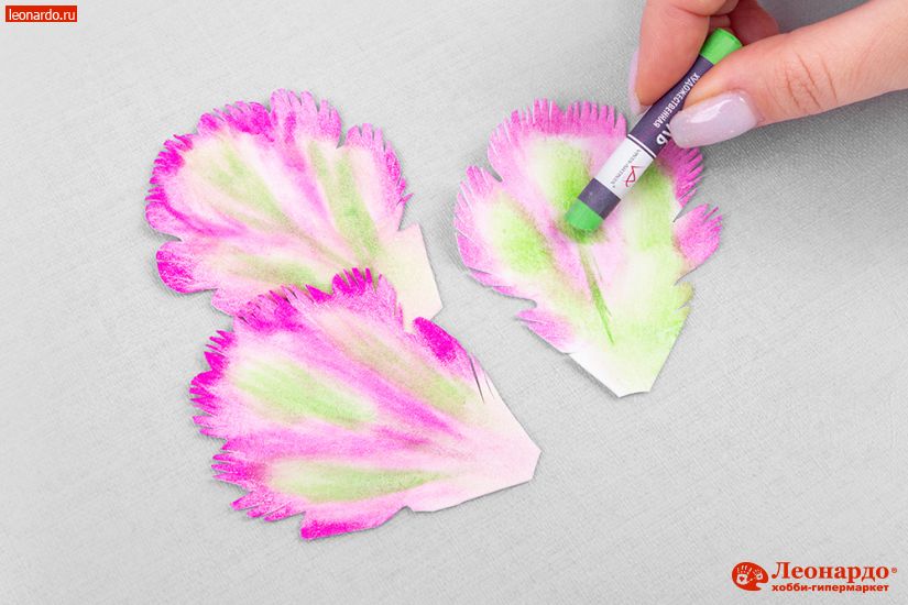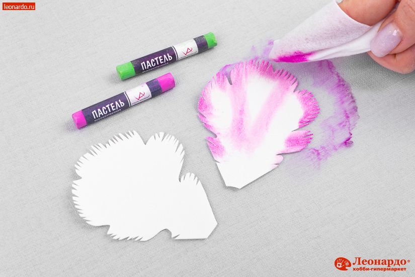 4. Переходим к тонировке, для этого используем сухую пастель VISTA-ARTISTA Studio (VASP-24). Набираем пигмент пастели на влажную салфетку и аккуратными движениями наносим розовый цвет на края лепестка и две полоски в центре.