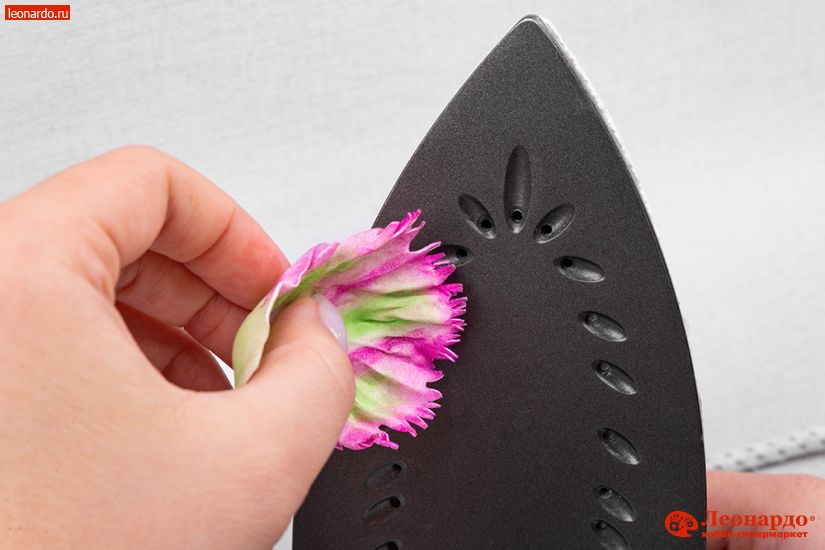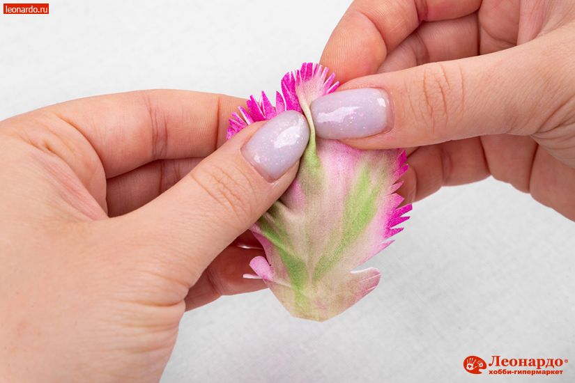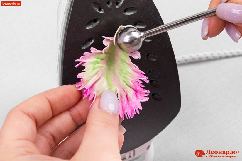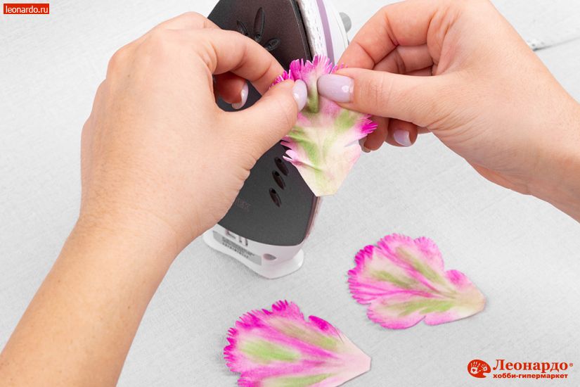 6. Переходим к обработке лепестков на утюге. Визуально делим лепесток пополам и рисуем диагональные прожилки как у листочка, по этим воображаемым прожилкам будем добавлять рельеф. Нагреваем лепесток на бортике утюга и сжимая пальцами получившуюся складку даем материалу остыть, зафиксировавшись в этом положении.