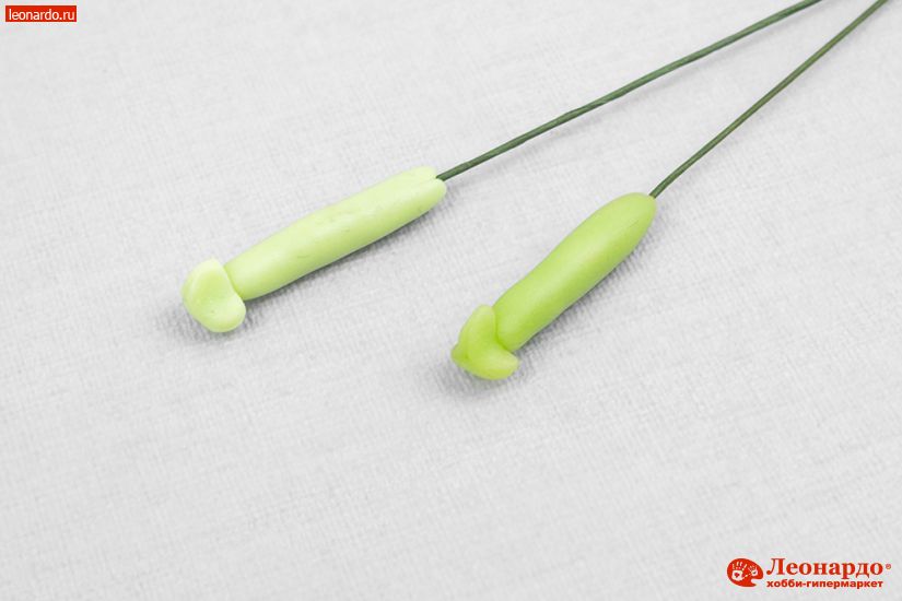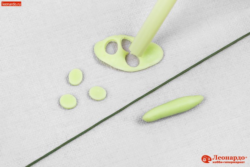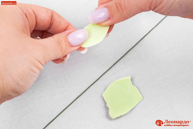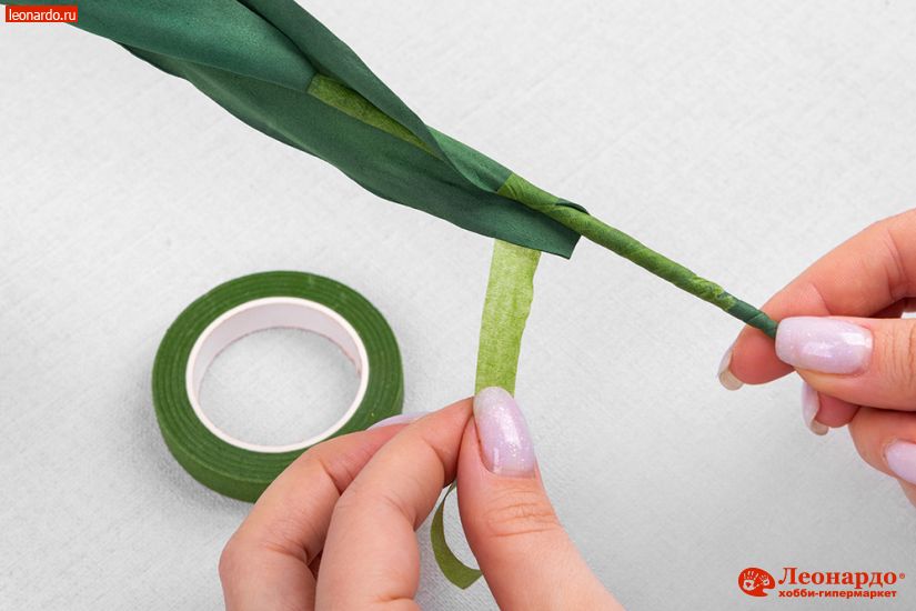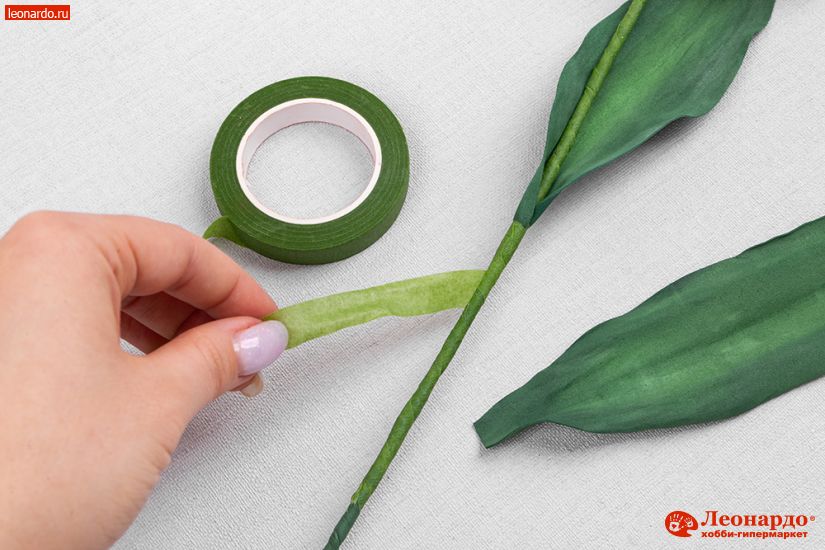 22. Затем обматываем стебель тейп-лентой Blumentag (арт. CLF). Опустившись на 1/3 длины стебля, фиксируем первый маленький листок, а чуть ниже второй – побольше.