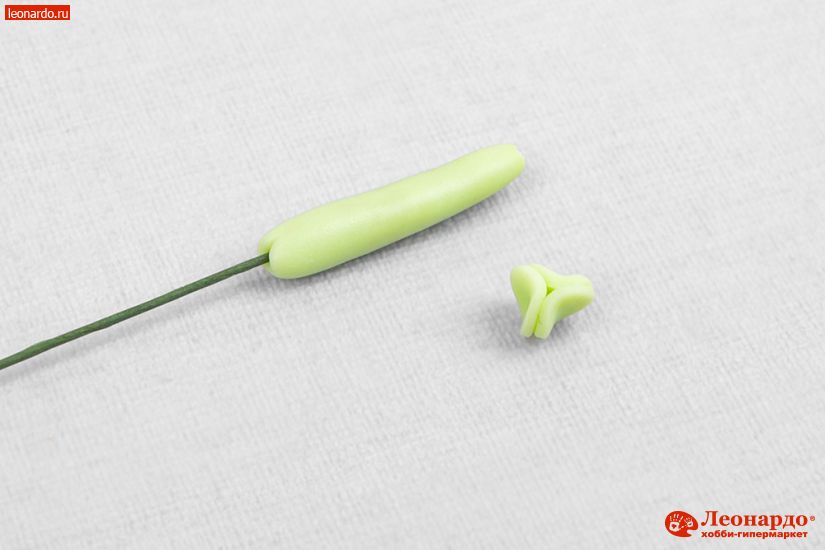 12. Слегка приминаем или обрезаем нижний край детали из трех кружочков и соединяем с колбаской, получился пестик. Запекаем в духовке при температуре 130 градусов, 15-20 минут. После запекания глина с эффектом матового стекла немного меняет цвет, оттенок становится более глубокий, полупрозрачный.