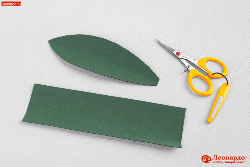 13. Переходим к созданию листочков. Из фоамирана темно-темно-зеленого цвета вырезаем прямоугольник, складываем его пополам в длину и вырезаем продолговатый лист.