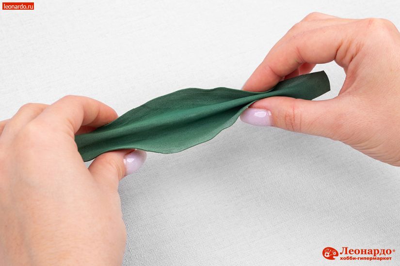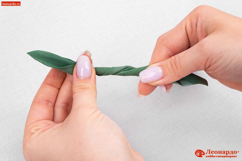 15. Складываем листок, как показано на фото и перекручиваем по всей длине, это придаст более натуралистичный вид форме нашей заготовки. Обрабатывать на утюге листок не нужно.