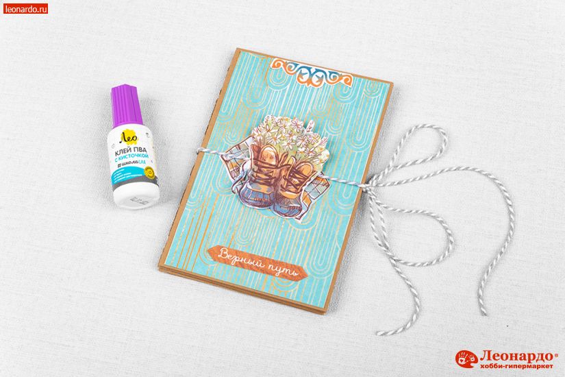 7. Приклеиваем все элементы на обложку на клей таким образом, чтобы один из элементов держал шнур.