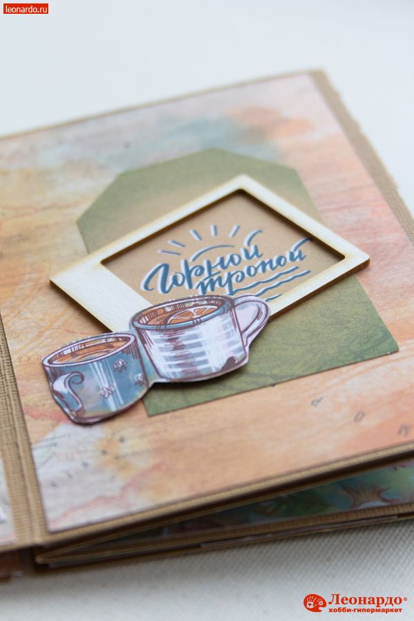 11. Несколько страничек украшаем крупными элементами, включая рамочки из чипборда «Шейкер» Mr.Painter (арт. CHI-25M). Приклеиваем крупные элементы на клей пва.