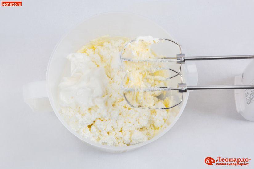 2. Добавляем сметану и протёртый через сито творог. Взбиваем всё до однородной консистенции.