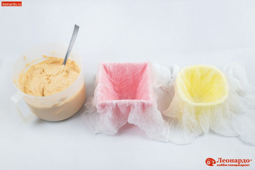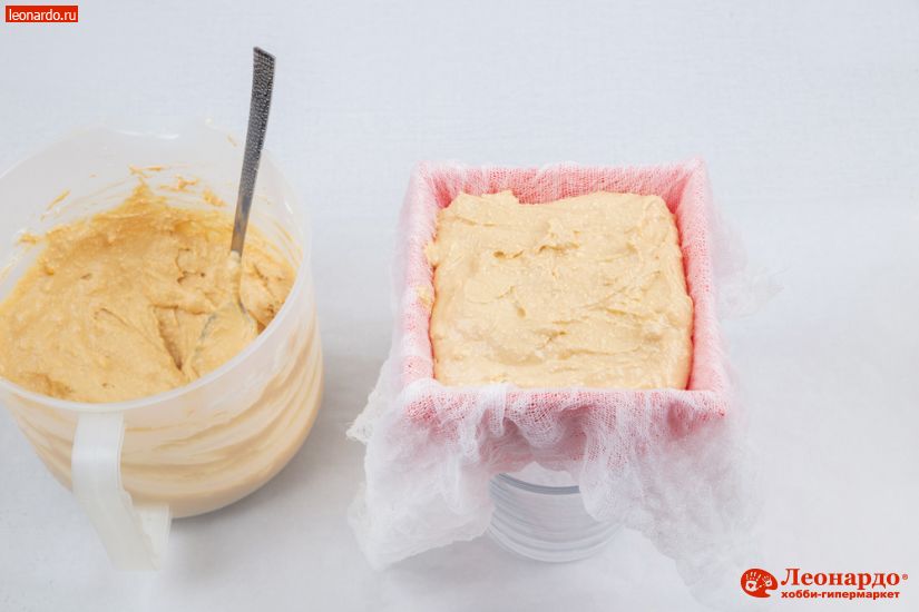 7. Формы S-CHIEF (арт. SHF-0340, SHF-0339) ставим в широкие ёмкости, чтобы верхушка пасхи не была плоской, а лишняя жидкость стекала на дно и не касалась формы. Выкладываем массу в формы до верха.
