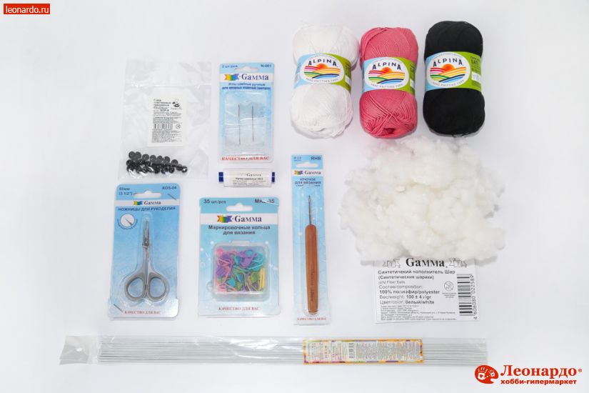 1. Пряжа ALPINA «SATI» 100% хлопок 50 г 170 м (№001 белый, №002 чёрный, №027 т. розовый) – расход по 1 мотку.