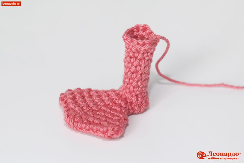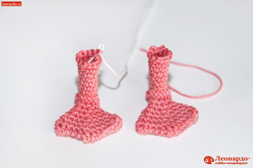 1-й ряд – 6ВП, 12СБН по первой ноге, 6СБН в воздушные петли, 12СБН по второй ноге и 6СБН по воздушным петлям (36).