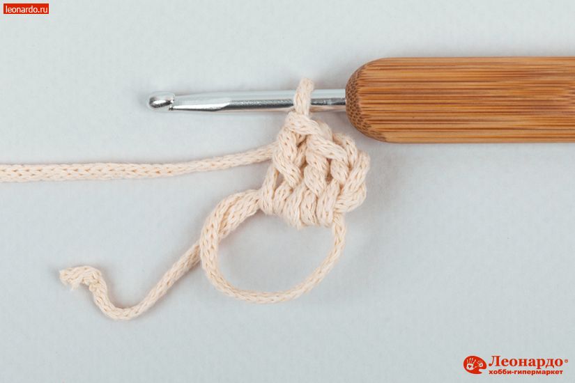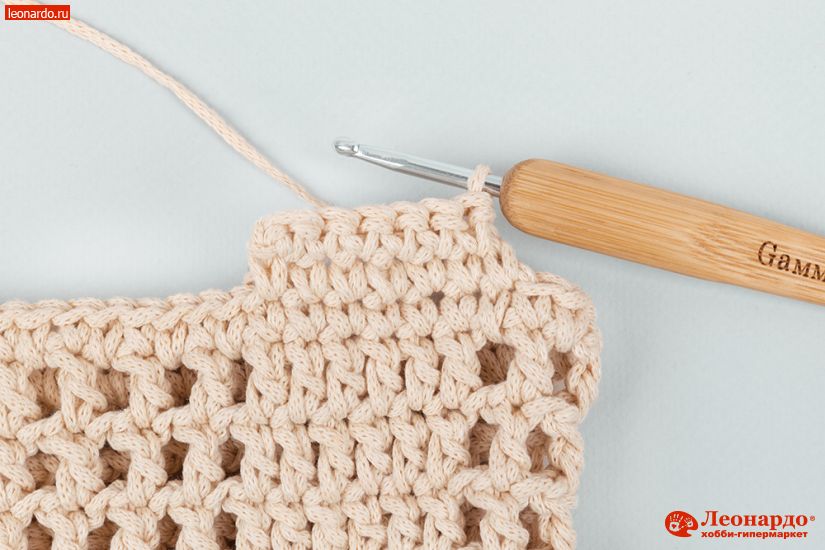 7. 13-й ряд. 4 ВП, пропускаем петлю, ССН, ВП, пропускаем петлю. Вяжем таким образом всего 7 ССН (ВП подъема заменяют первый ССН).