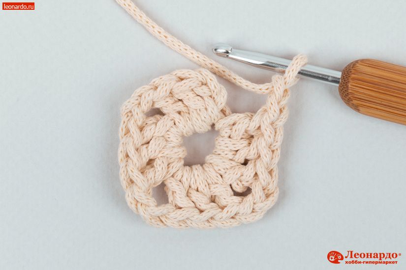 3. 2-й ряд. 3 ВП. Над столбиками предыдущего ряда вяжем ССН, под ВП в углах вяжем 2 ССН, 2 ВП, 2 ССН.