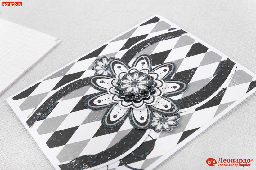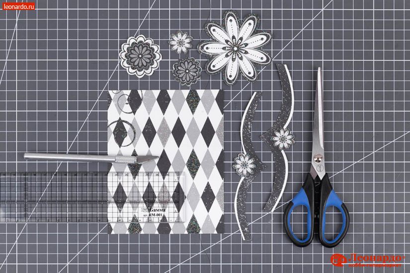 2. Из листа скрапбумаги Mr.Painter (арт. PSF (190) 043 Черно-белое) вырезаем фоновую деталь размером 11.5х14.5см, а также элементы рамочки и цветы.