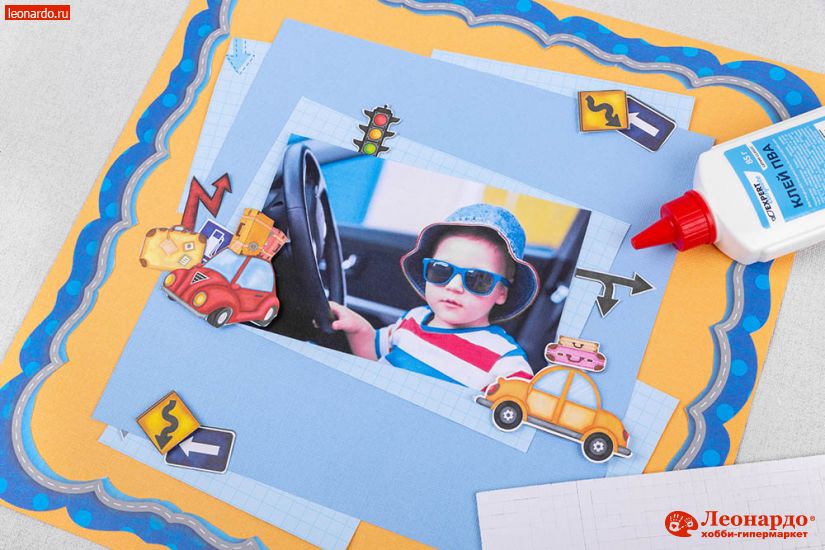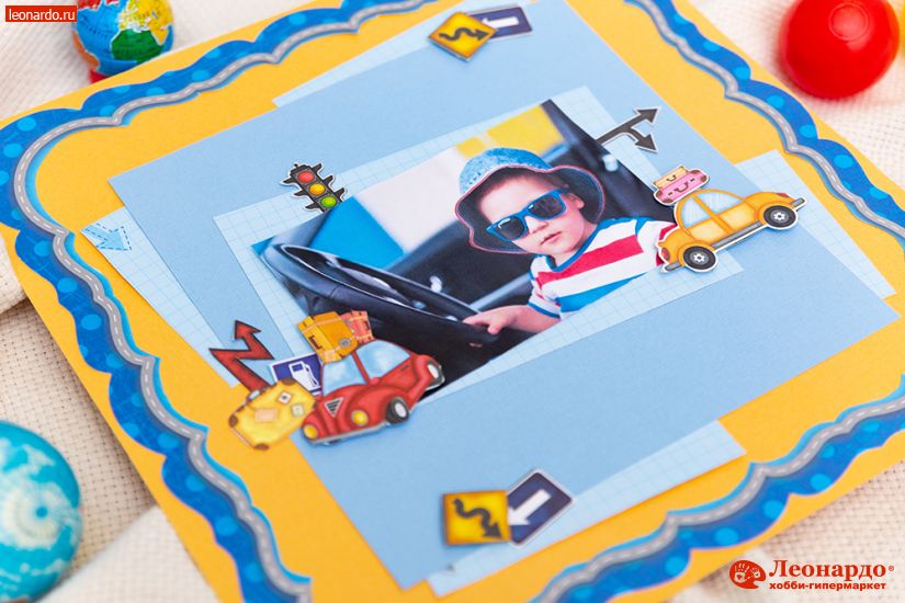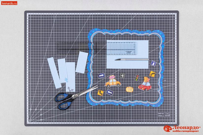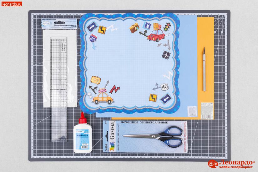 1. Из листа бумаги для скрапбукинга Mr.Painter (арт. PSL (190)096 Машинки) вырезаем при помощи ножниц GAMMA (арт. G-204) и макетного ножа Mr.Painter (арт. HKN) рамку, фоновую деталь формата 17х11см и элементы с картинками. Остатки фонового листа разрезаем на прямоугольники разных размеров.