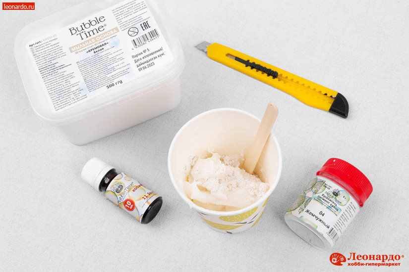 1. Мягкую мыльную основу BUBBLE TIME "КРЕМОВАЯ" (арт. SLS free KREM-05) размещаем в термостойком стакане "BOOMZEE" (арт. TSS-06). Добавляем жемчужный пигмент и отдушку "BUBBLE TIME" (арт. ODM 40 11 "Зеленый чай") для тонизирующего воздействия. Растворяем основу на средней температуре, чтобы стала жидкой, но не закипела.