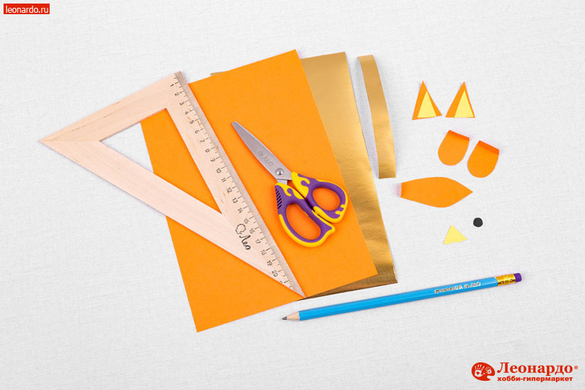 1. Для изготовления Лисы нам понадобится цветная бумага Лео «Играй» (арт. LPCPS-01) желтого и оранжевого цвета, а также фольгированная золотая бумага для отделки.