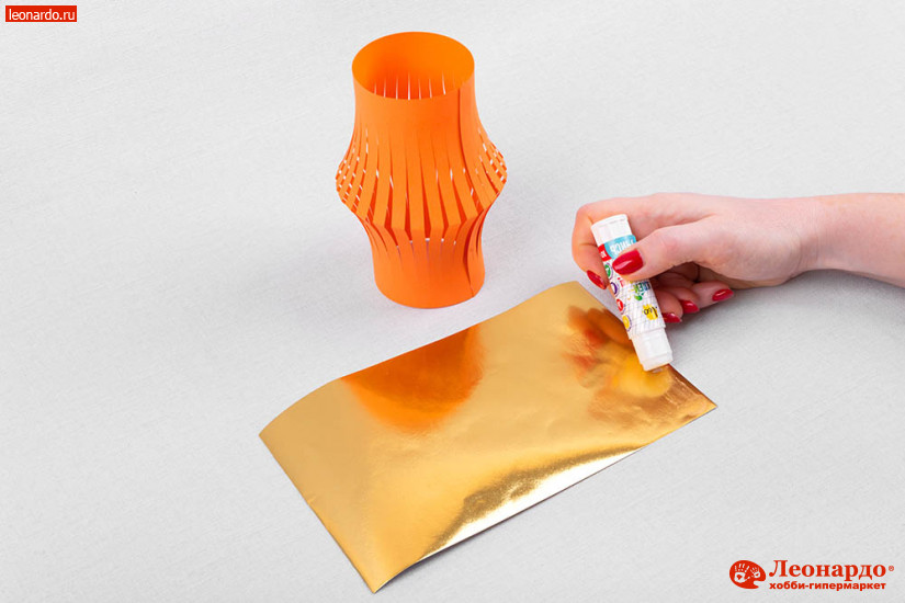 8. Верхний край золотой бумаги смазываем клеем и прижимаем к фонарику.