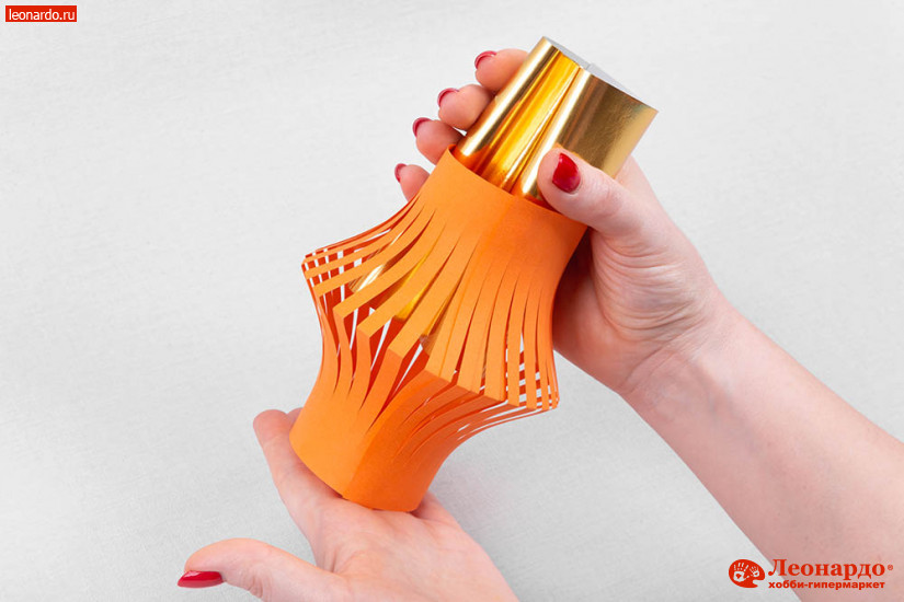 7. Сворачиваем заготовку в виде цилиндра, края склеиваем. Вставляем золотую деталь в фонарик.