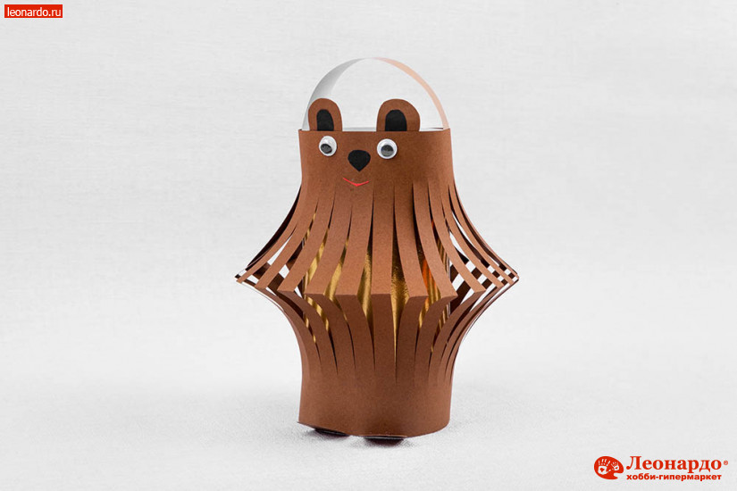 14. Если взять цветную бумагу коричневого цвета и немного изменить форму ушек, сделав их полукруглыми, то получится фонарик в форме Медведя.