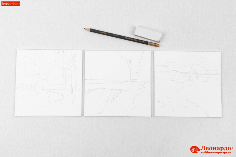 1. Вначале выполним карандашный набросок на всех холстах. Пусть на каждом рисунке линия горизонта будет различной. Не углубляйтесь в детали, основное мы будем прорисовывать сразу кистью.