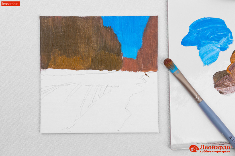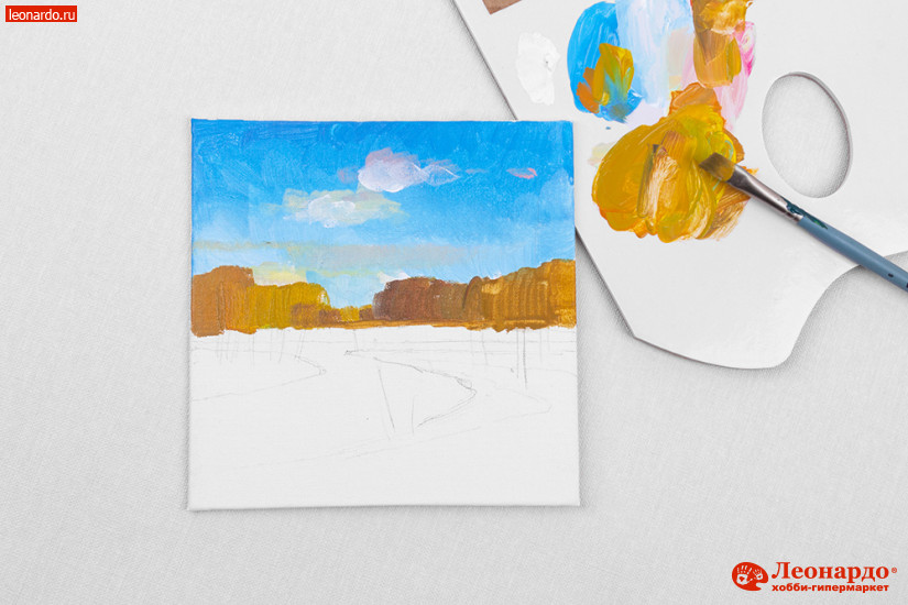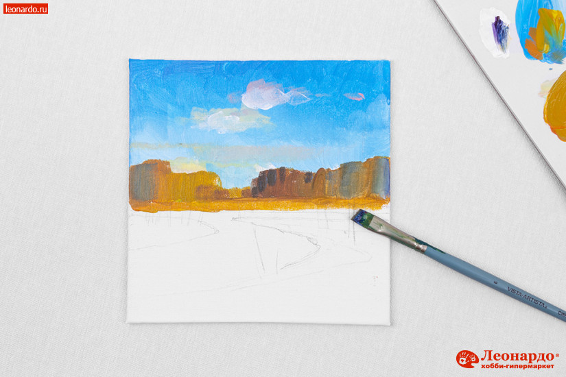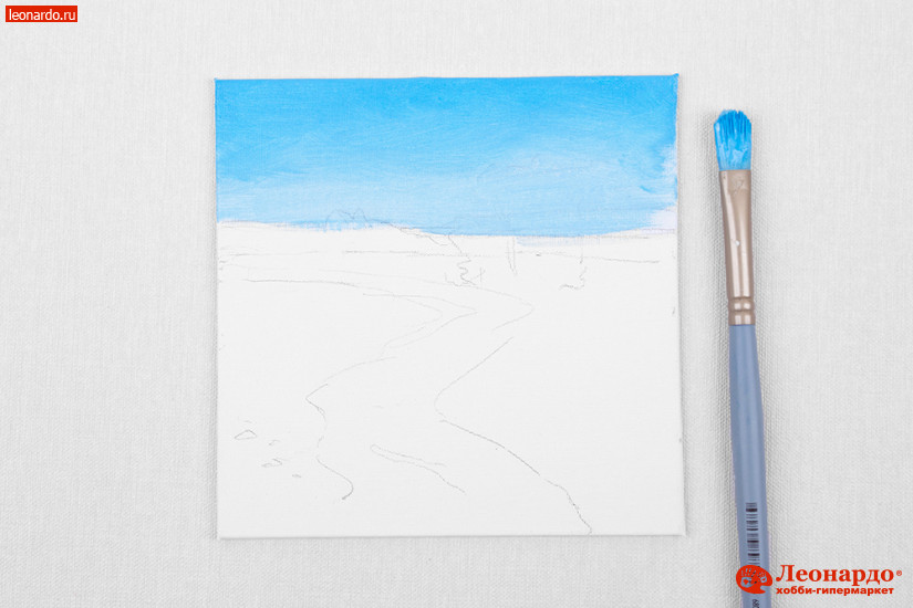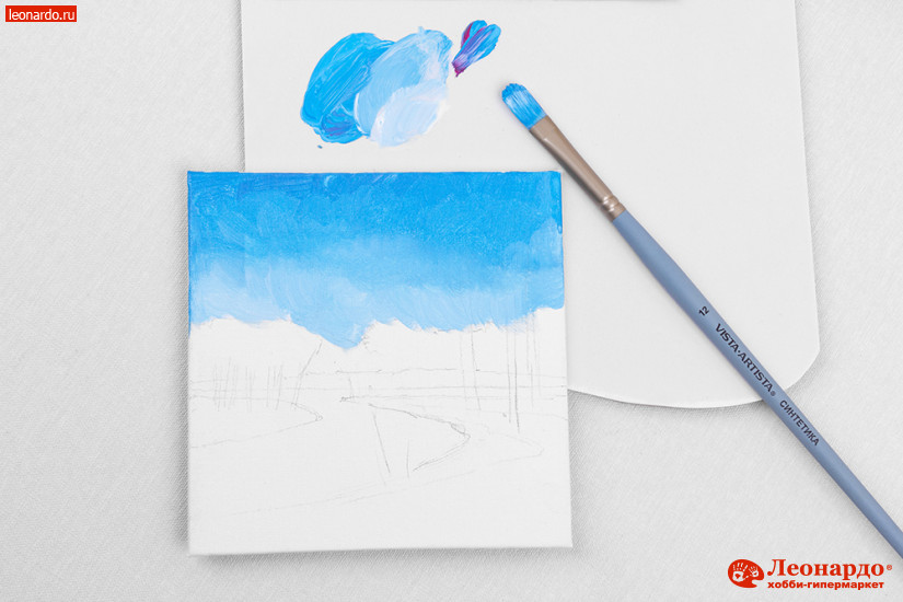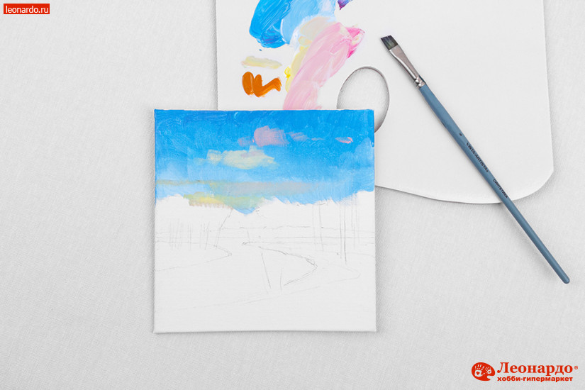 2. Начнём с первой картины. Это мартовский пейзаж. Используя белила, небесно-голубую краску и немного карминовой, пишем небо. У горизонта оно будет немного светлее.