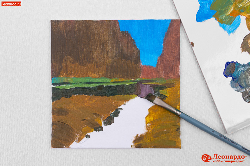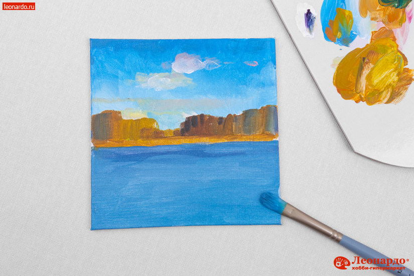 15. Пишем отражение неба в воде, используя синие оттенки и белила. Пусть небо в отражении будет чуть темнее. Далее пишем отражение среднего плана в воде.