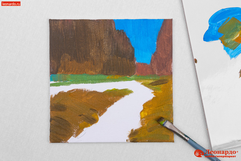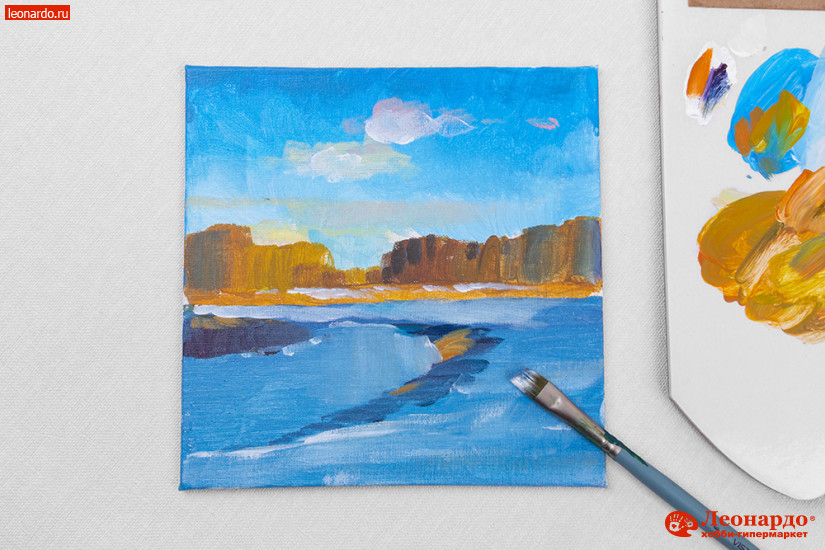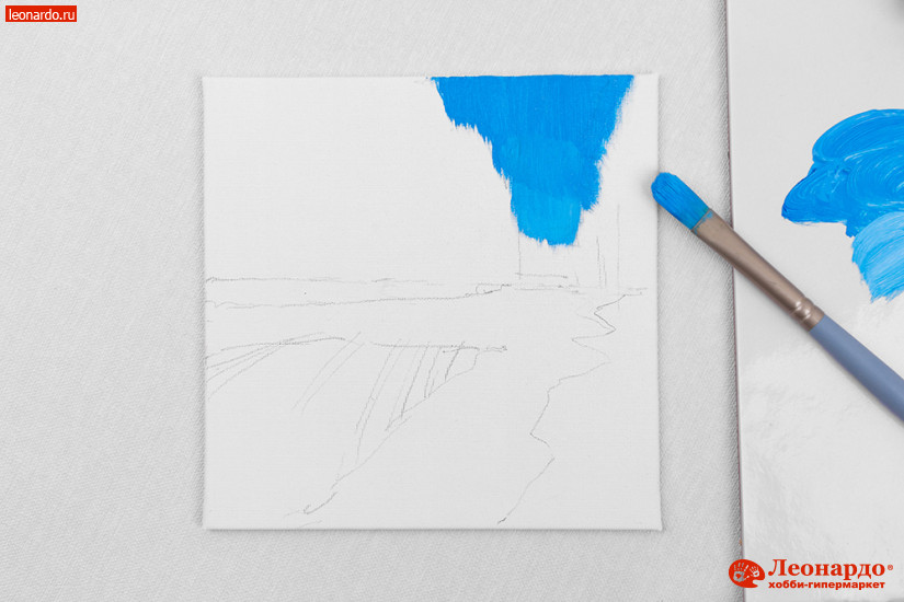 11. Теперь приступаем ко второй картине. Рисуем апрельский пейзаж. Используя белила и небесно-голубую краску, пишем кусочек неба. К горизонту небо делаем немного светлее.