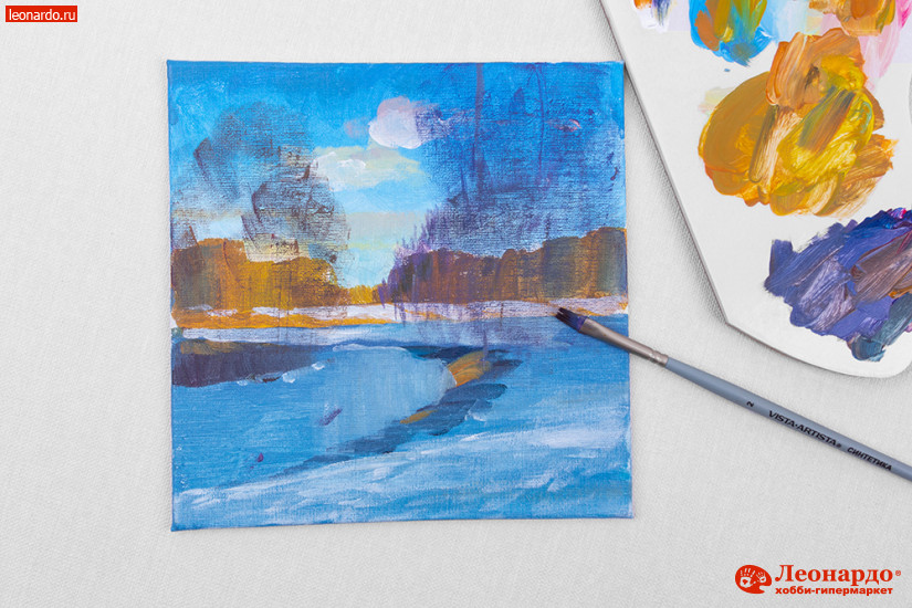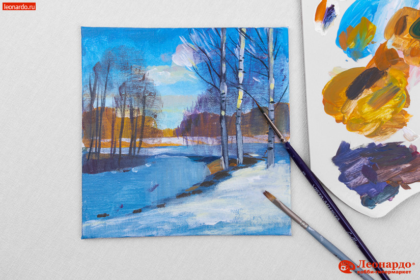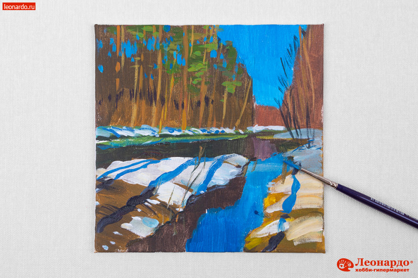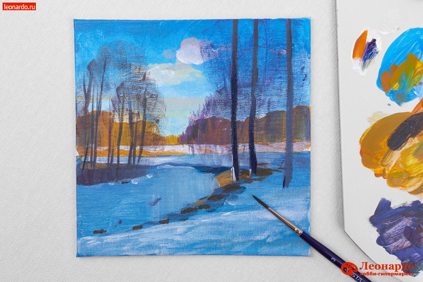 7. Используя белый, высветляем поверхность замерзшей реки, добавляем немного снега на освещённый солнцем план и с помощью голубой, тёмно-зеленой и красной краски пишем более тёмные берега речки. Обратите внимание на направление мазков, они все должны быть горизонтальными.
